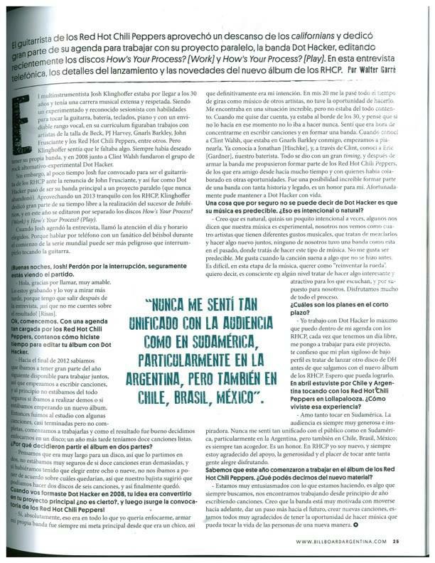 Začiatkom januára 2015 Josh Klingoffer poskytol telefonický rozhovor pre Billboard Argentina. A čo prezradil Josh o novom albume Red Hot Chili Peppers?